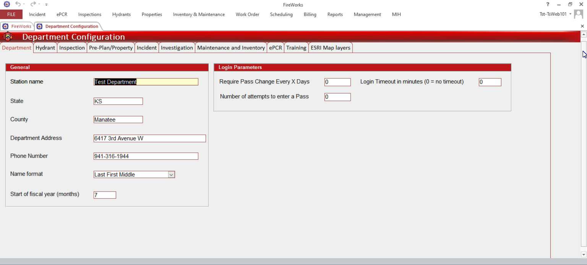 The Department Configuration section provides centralized control over all EPR FireWorks module settings through a unified interface. This consolidates configuration parameters that were previously scattered across individual modules, giving administrators streamlined access to operational settings for NFIRS, ePCR, inspections, training, and system integrations.