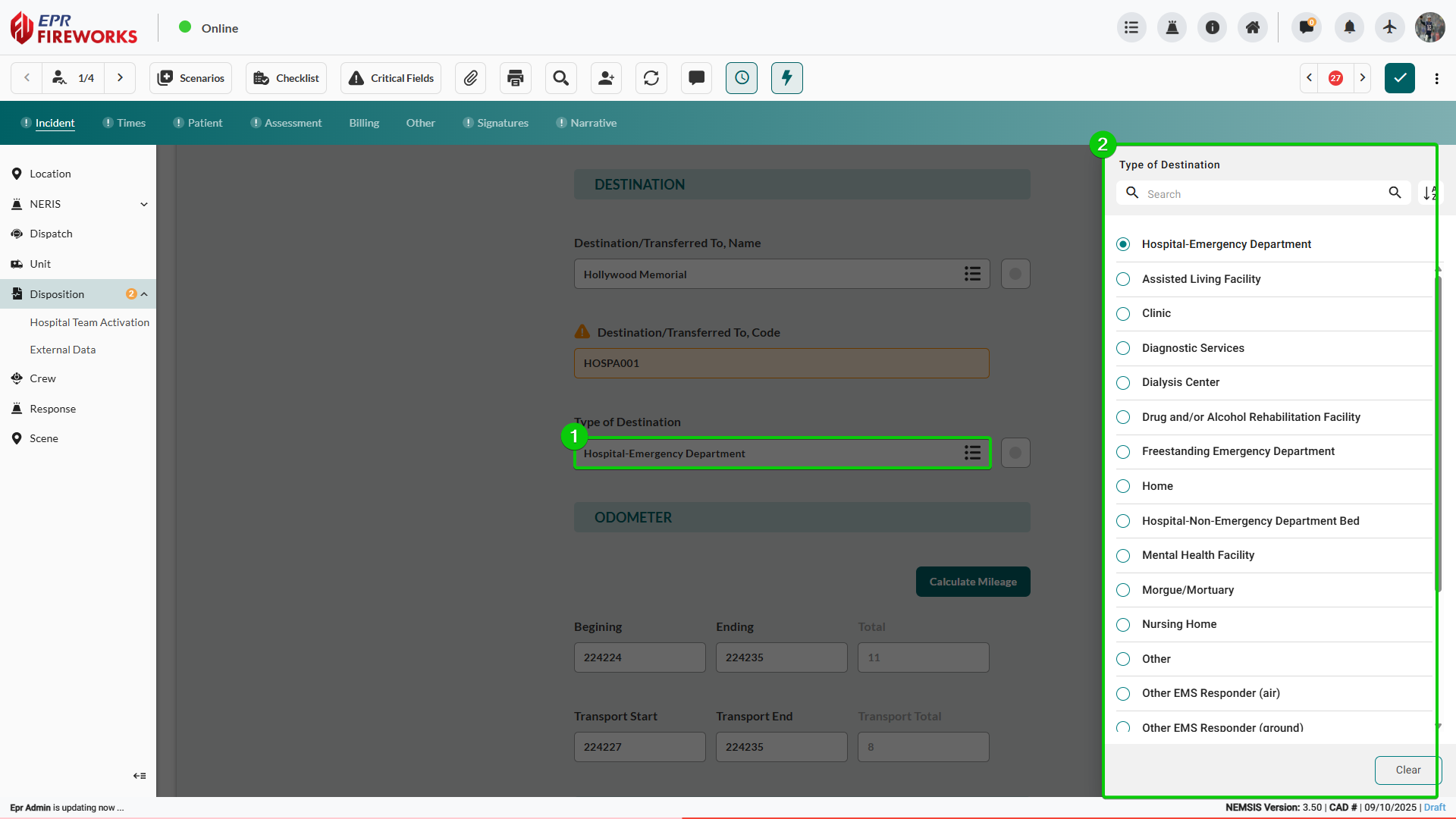 Complete transport destination documentation for NEMSIS compliance by documenting destination codes and facility types, recording all required odometer readings, and completing destination address fields.