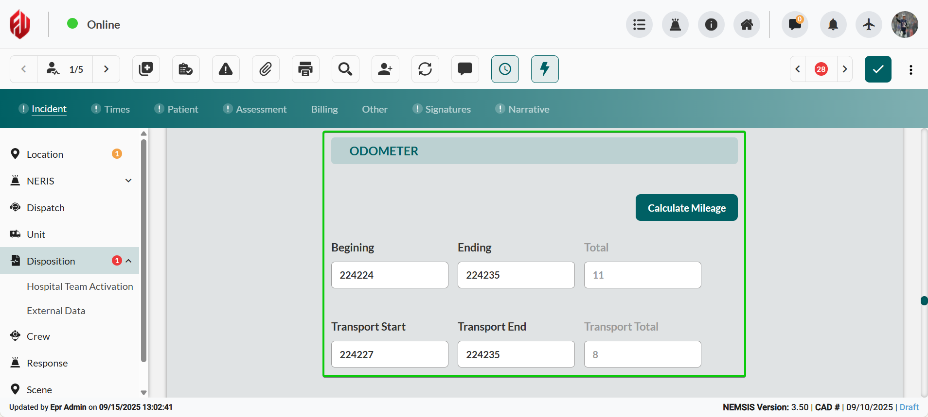 In the Ending field, enter mileage reading after returning from the incident.